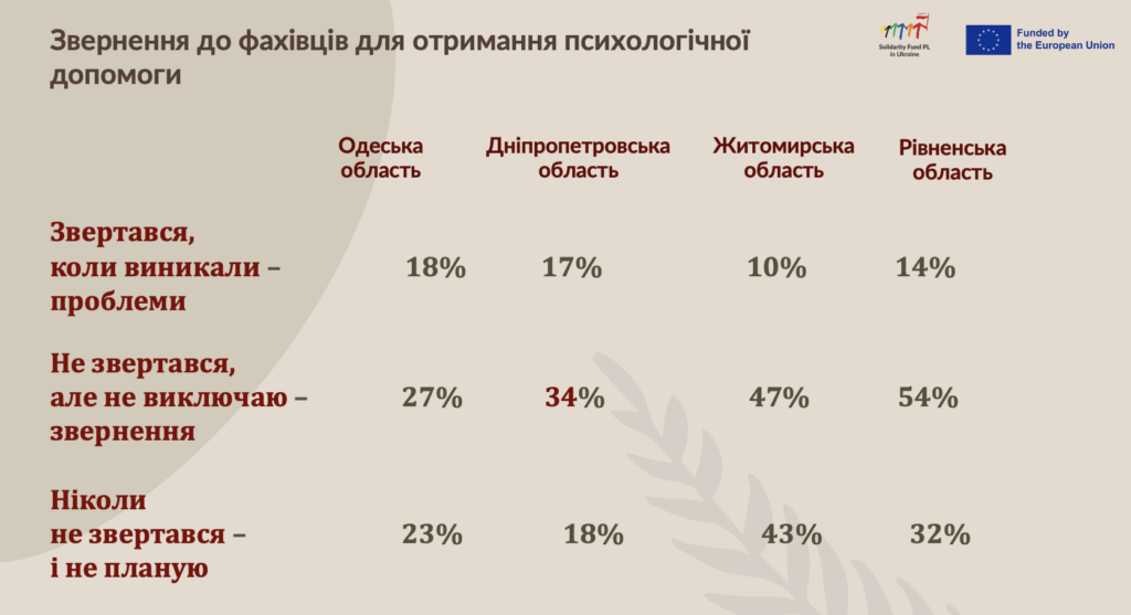 18% of surveyed residents of the Odesa region reported that they had turned to specialists for psychological help when problems arose. In the Dnipropetrovsk region, this figure was 17% (for comparison: in Zhytomyr region – 10%, in Rivne region – 14%). At the same time, 34% of residents of the Dnipropetrovsk region who participated in the study said that they were ready to seek such help if necessary. For the Odesa region, this figure was 27%, for the Zhytomyr region – 47%, for the Rivne region – 54%.